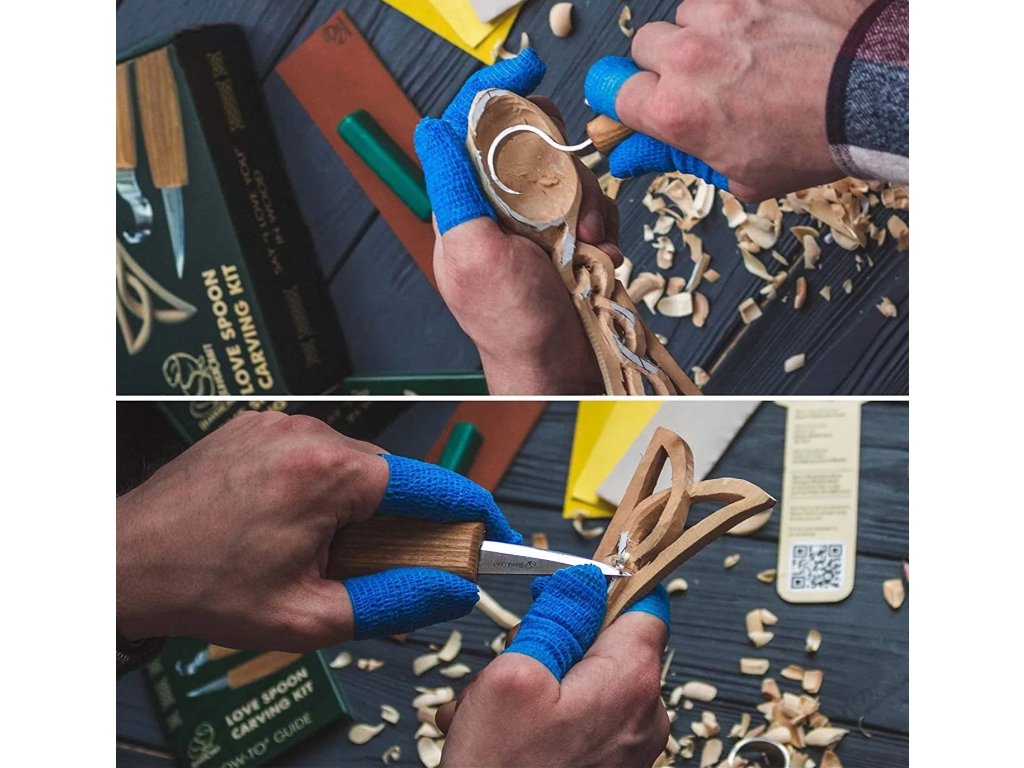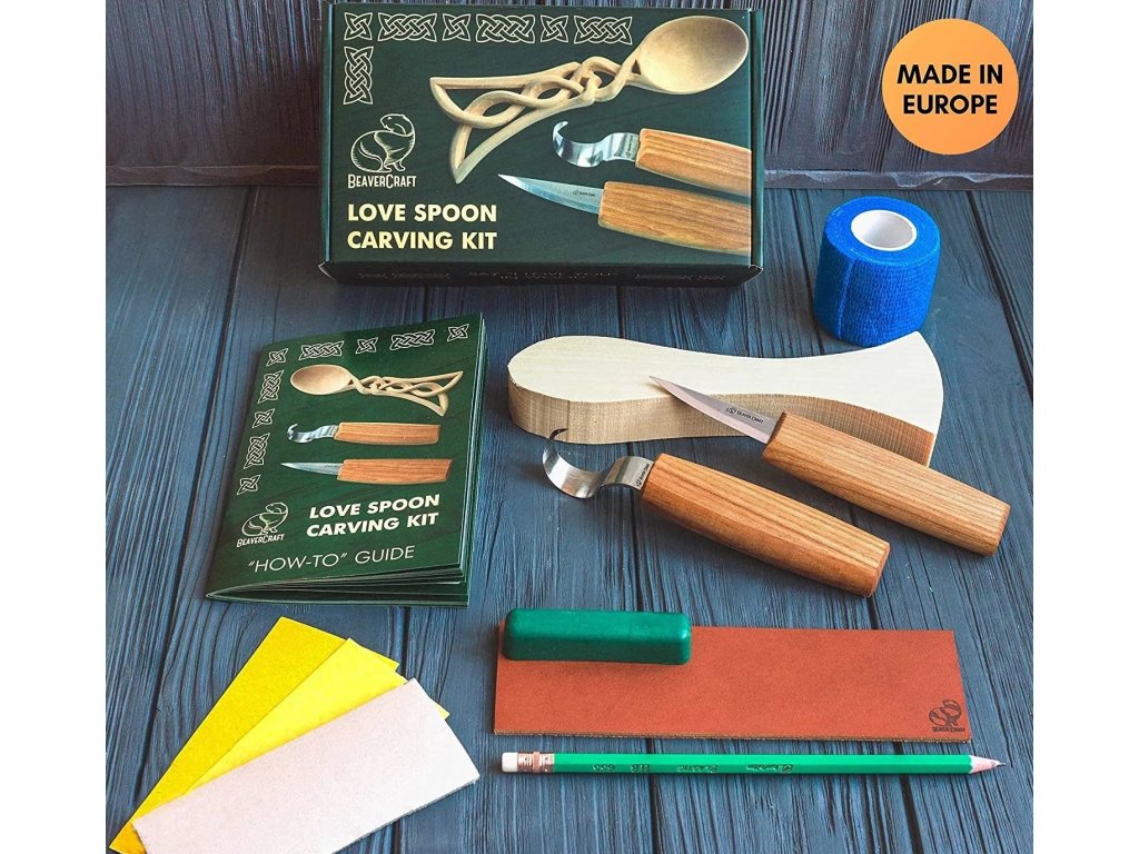 Kit pentru sculptura în lemn pentru începători. Setul include un cuțit C14, un cuțit pentru sculptarea lingurilor SK1, accesorii pentru ascuțirea cuțitelor, bandă de protecție și un model pre-pregătit al unei linguri din lemn de tei și un link către instrucțiunile pentru sculptarea lingurii.