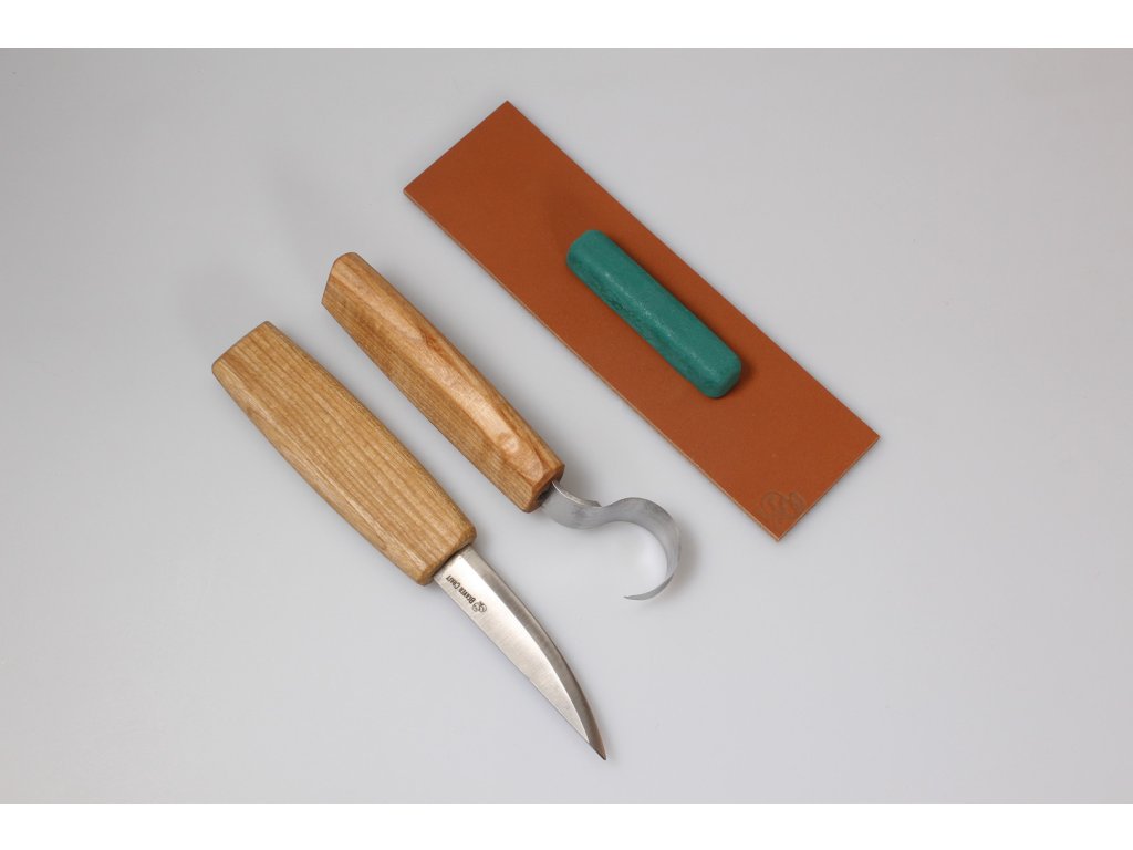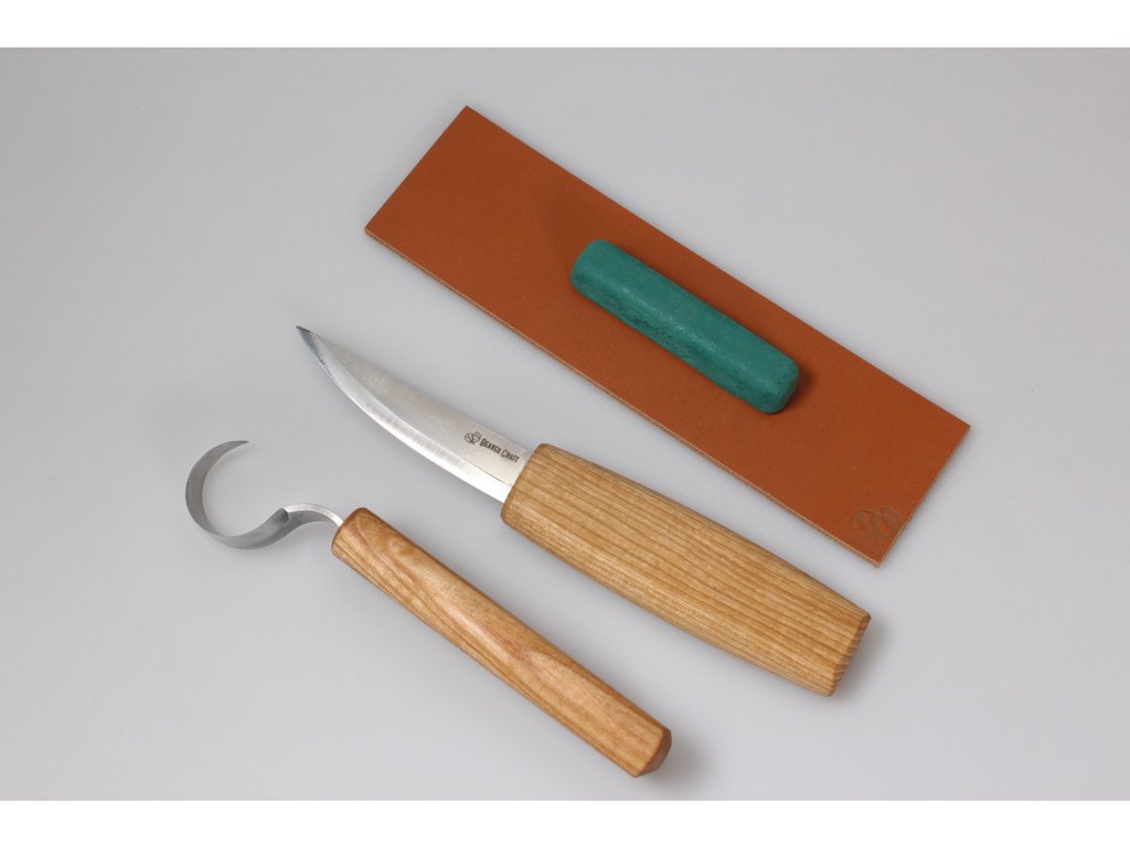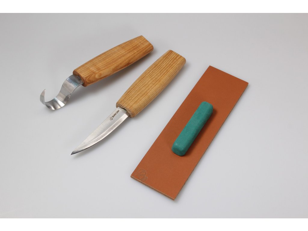 Kit de bază pentru sculptură în lemn de la BeaverCraft. Include un cuțit pentru sculptarea lingurilor și un cuțit universal cu lamă lungă pentru sculptura în lemn. Cuțitele sunt foarte ascuțite, iar tăietura rezultată este foarte fină, fără fisuri în lemn. Lamele sunt fabricate din oțel carbon 65G, duritate 57-59 HRC. Oțelul carbon rezistă bine la uzură și este ușor de ascuțit, dar este mai predispus la rugină (cuțitul trebuie curățat și uscat bine după utilizare, de asemenea, este recomandabil să ungeți lama ocazional cu ulei). Mânerul este realizat din lemn de frasin, impregnat cu ulei de in.