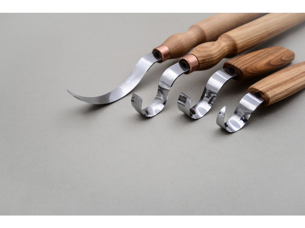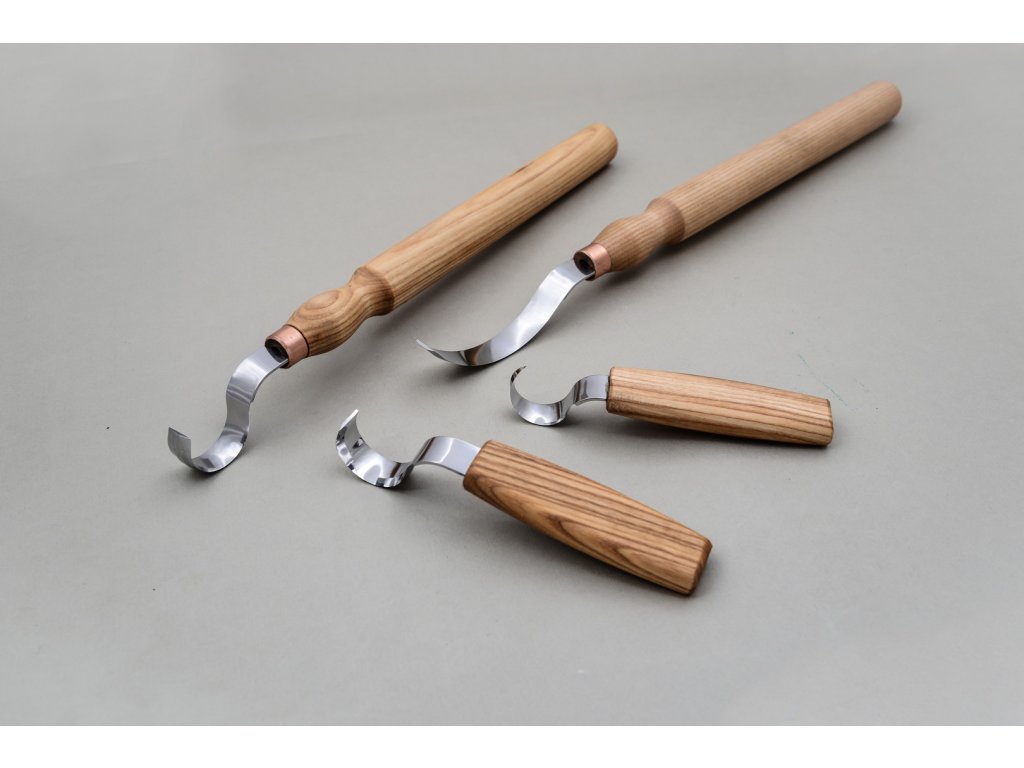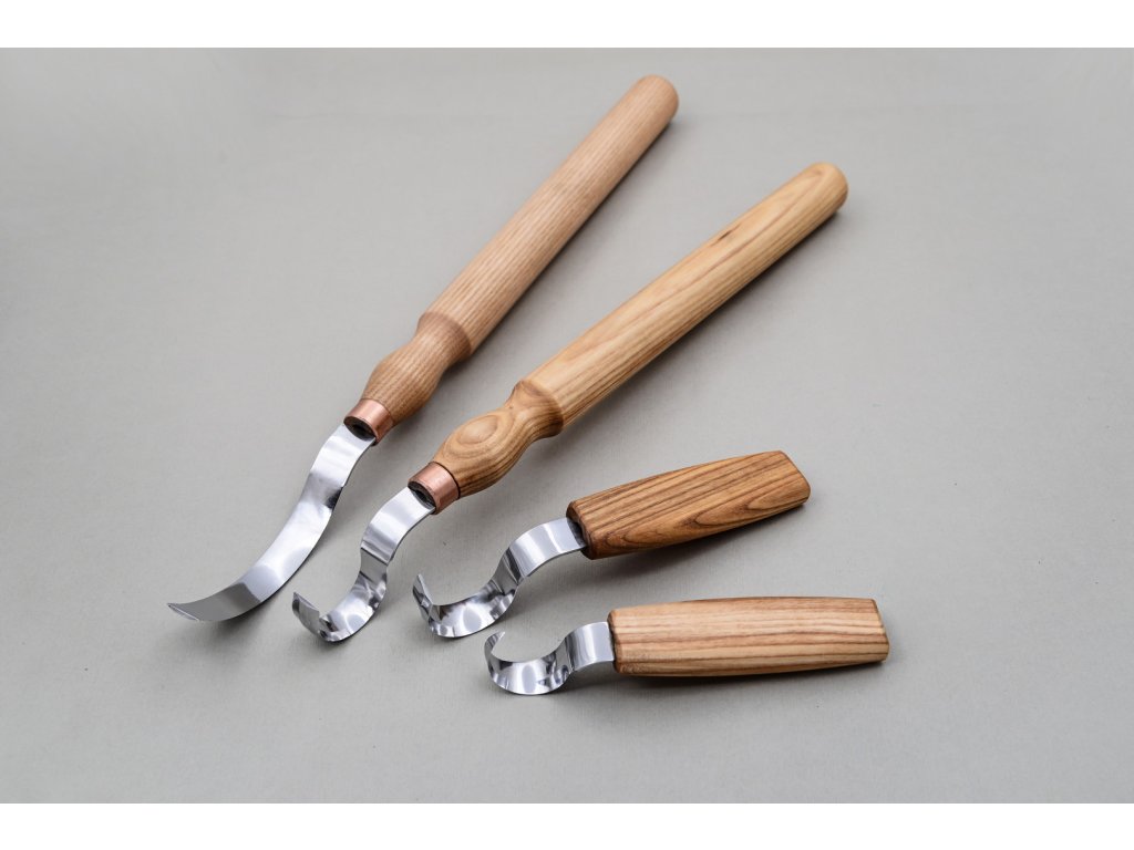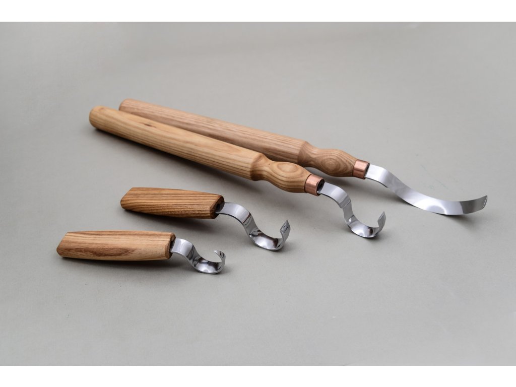 Set pentru sculptat linguri și alte obiecte din lemn de la BeaverCraft. Include patru cuțite în formă de lingură de diferite dimensiuni. Cuțitul pentru sculptarea lingurilor (spoon carver) este special adaptat pentru sculptarea lingurilor, bolurilor, kuksy și a altor piese în care trebuie să faceți o cavitate în lemn. Cuțitele sunt foarte ascuțite, iar tăietura rezultată este foarte fină, fără fisuri în lemn. Lamele sunt fabricate din oțel carbon 65G, duritate 57-59 HRC. Oțelul carbon rezistă bine la uzură și este ușor de ascuțit, dar este mai predispus la rugină (cuțitul trebuie curățat și uscat bine după utilizare, de asemenea, este recomandabil să ungeți lama ocazional cu ulei). Mânerul este realizat din lemn de frasin, impregnat cu ulei de in.
