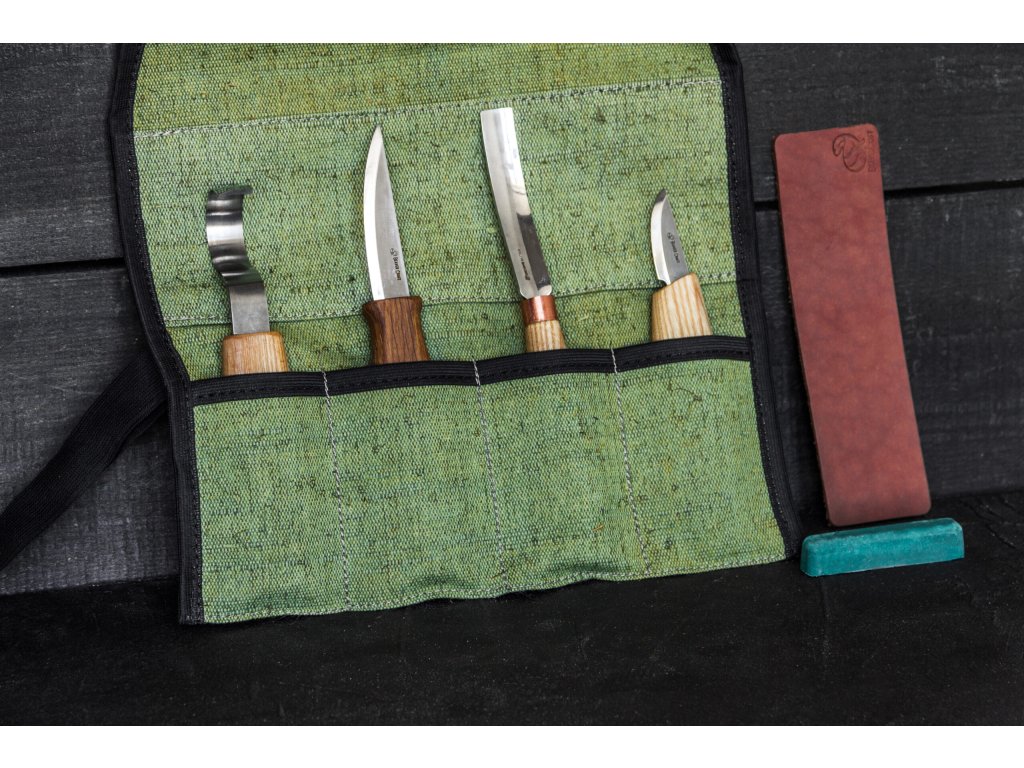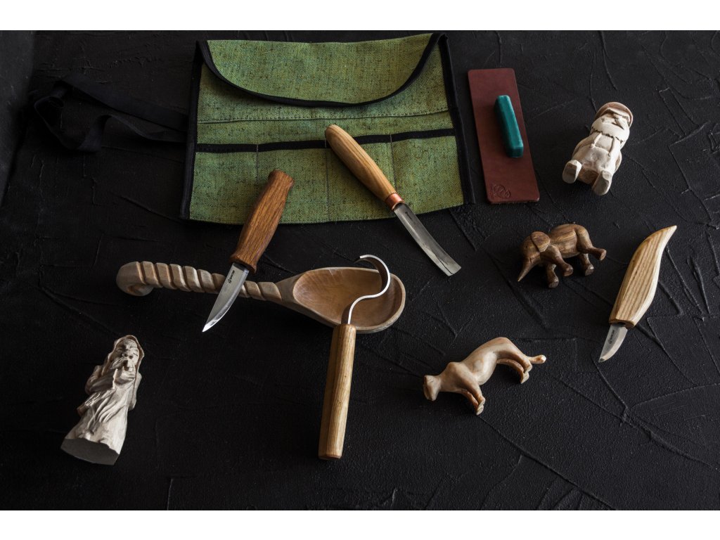 Setul conține 3 cuțite pentru sculptură și o daltă, într-o husă textilă, care vă permit să transformați orice idee de sculptură în realitate. Cuțitele din acest set au un mâner ergonomic, proiectat și conturat astfel încât mâinile să nu obosească nici după multe ore de lucru. Instrumentele pentru sculptură se pot depozita în husa textilă, care este inclusă în set.