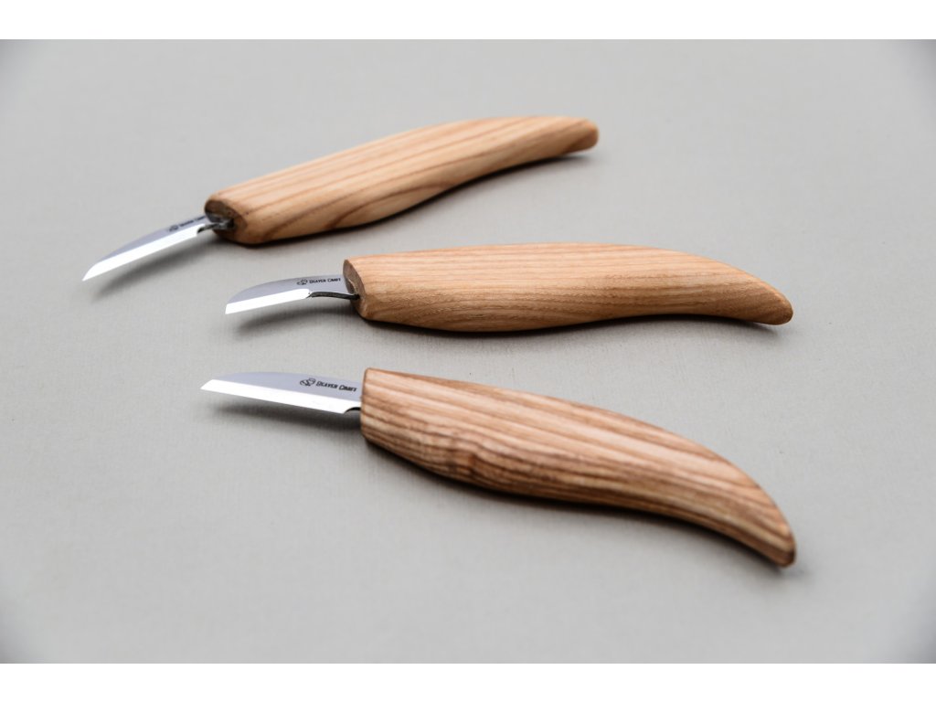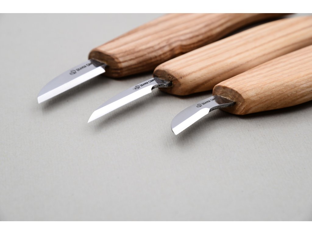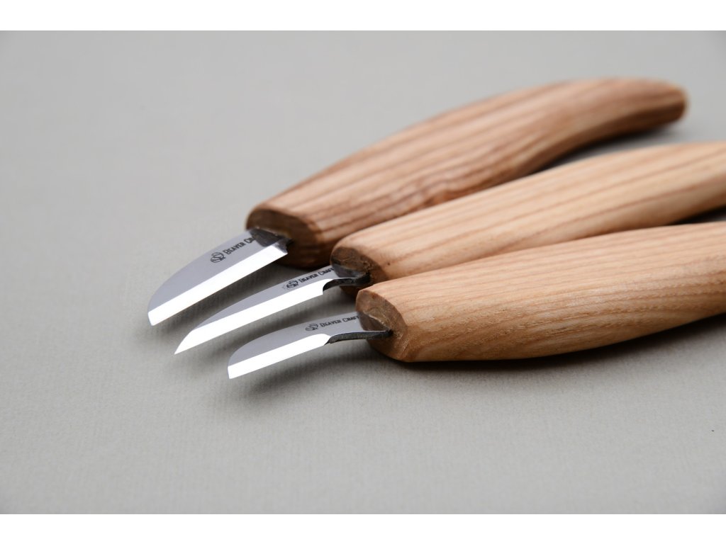 Kit de trei cuțite speciale pentru sculptura în lemn BeaverCraft pentru sculptura în detaliu. Cuțitele sunt foarte ascuțite, iar tăietura rezultată este foarte fină, fără fisuri în lemn. Lamele sunt fabricate din oțel carbon 65G, duritate 57-59 HRC. Oțelul carbon rezistă bine la uzură și este ușor de ascuțit, dar este mai predispus la rugină (lama trebuie curățată și uscată bine după utilizare, de asemenea, este recomandabil să o ungeți ocazional cu ulei). Mânere din lemn de frasin, impregnate cu ulei de semințe de in.