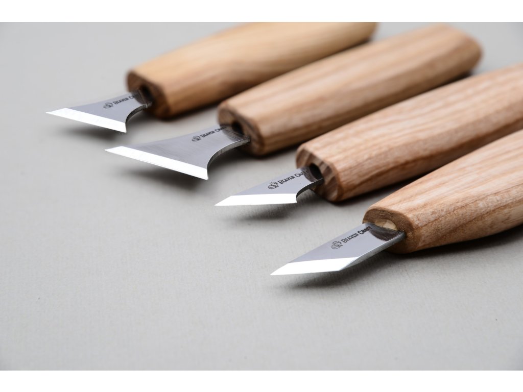 Kit de patru cuțite speciale pentru sculptura în lemn BeaverCraft pentru sculptura geometrică. Cuțitele sunt foarte ascuțite, iar tăietura rezultată este foarte fină, fără fisuri în lemn. Lamele sunt fabricate din oțel carbon 65G, duritate 57-59 HRC. Oțelul carbon rezistă bine la uzură și este ușor de ascuțit, dar este mai predispus la rugină (lama trebuie curățată și uscată bine după utilizare, de asemenea, este recomandabil să o ungeți ocazional cu ulei). Mânere din lemn de frasin, impregnate cu ulei de semințe de in.