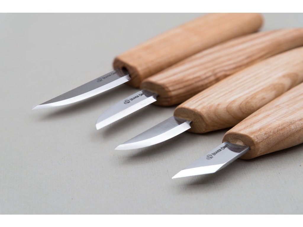 Kit universal format din patru tipuri de cuțite pentru sculptura în lemn, de la BeaverCraft. Cuțitele sunt foarte ascuțite, iar tăietura rezultată este foarte fină, fără fisuri în lemn. Lamele sunt fabricate din oțel carbon 65G, duritate 57-59 HRC. Oțelul carbon rezistă bine la uzură și este ușor de ascuțit, dar este mai predispus la rugină (cuțitul trebuie curățat și uscat bine după utilizare, de asemenea, este recomandabil să ungeți lama ocazional cu ulei). Mânerul este realizat din lemn de frasin, impregnat cu ulei de in.