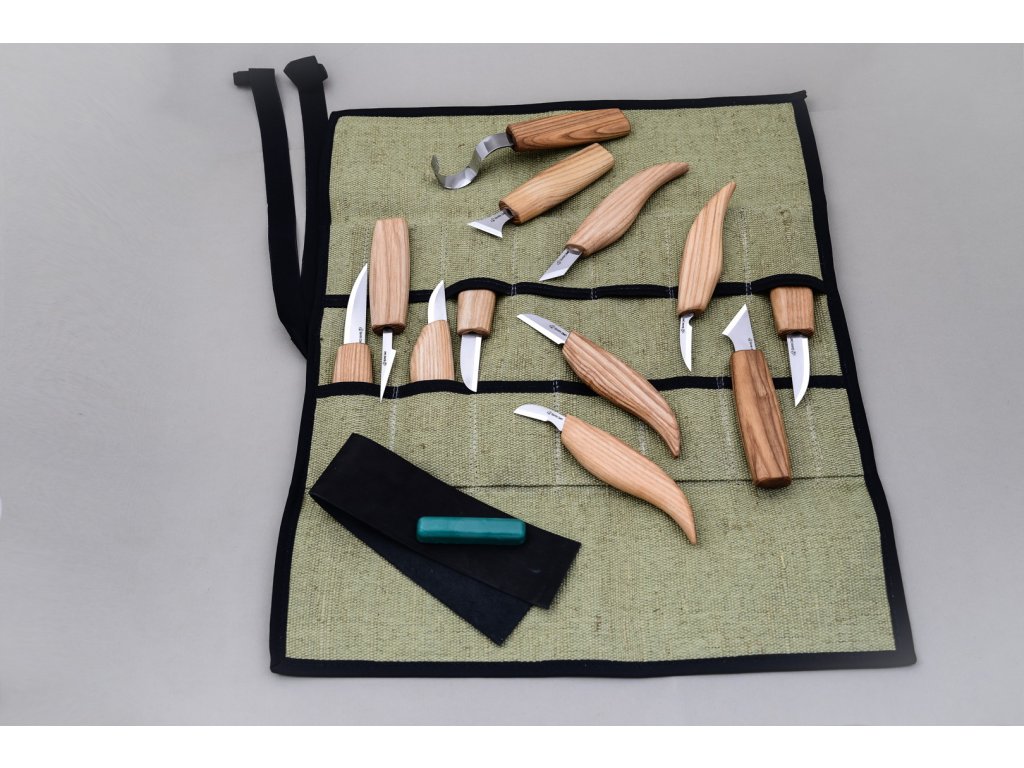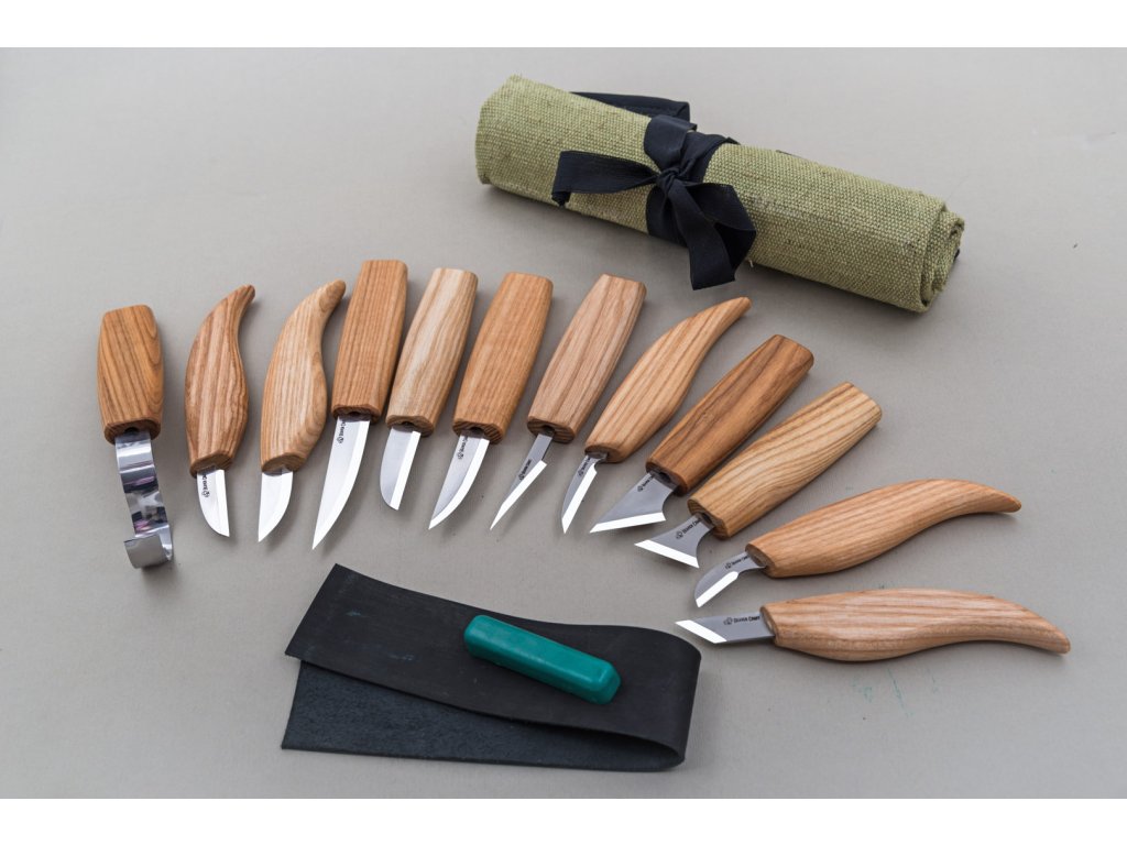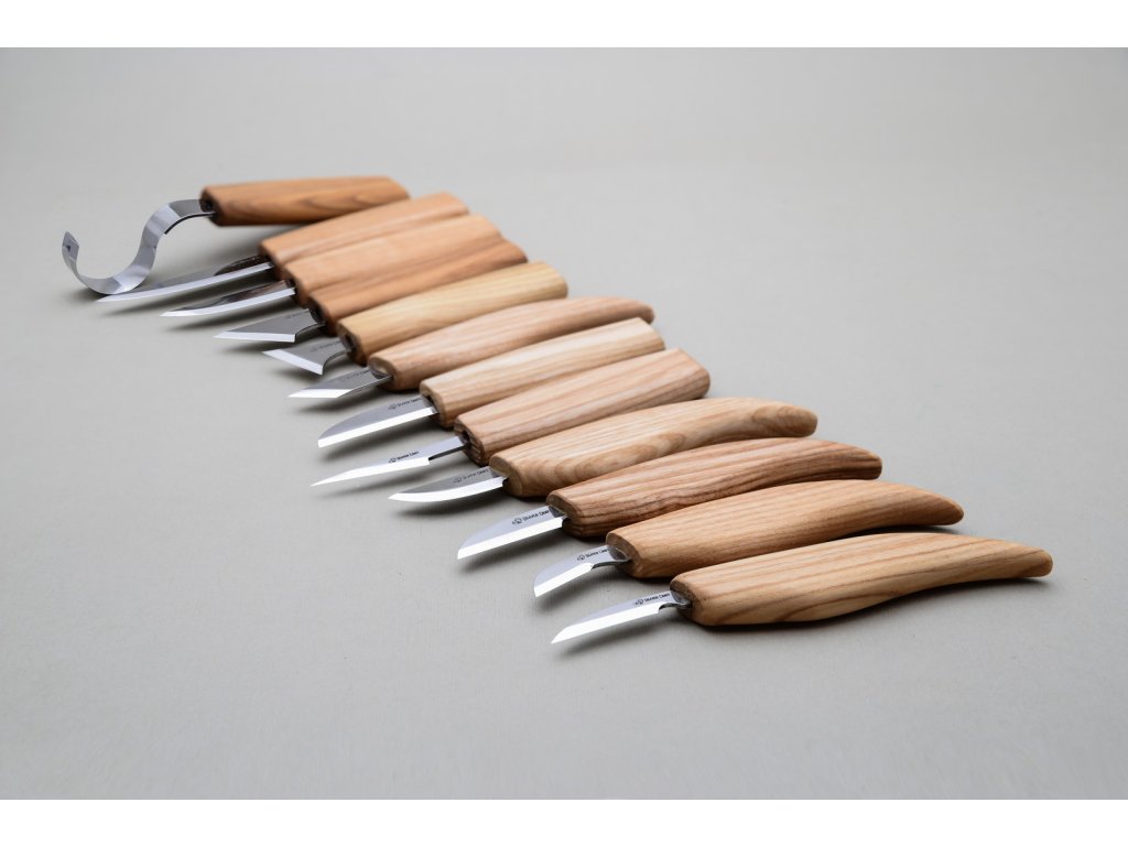 Kit mare de cuțite pentru sculptura în lemn de la BeaverCraft, inclusiv un cuțit pentru sculptarea lingurilor. Include douăsprezece cuțite pentru sculptura în lemn. Cu acest set puteți sculpta o varietate de forme și modele diferite, cum ar fi linguri, oale și altele. Cuțitele sunt foarte ascuțite, iar tăietura rezultată este foarte fină, fără fisuri în lemn. Lamele sunt fabricate din oțel carbon 65G, duritate 57-59 HRC. Oțelul carbon rezistă bine la uzură și este ușor de ascuțit, dar este mai predispus la rugină (cuțitul trebuie curățat și uscat bine după utilizare, de asemenea, este recomandabil să ungeți lama ocazional cu ulei). Mânerul este realizat din lemn de frasin, impregnat cu ulei de in.