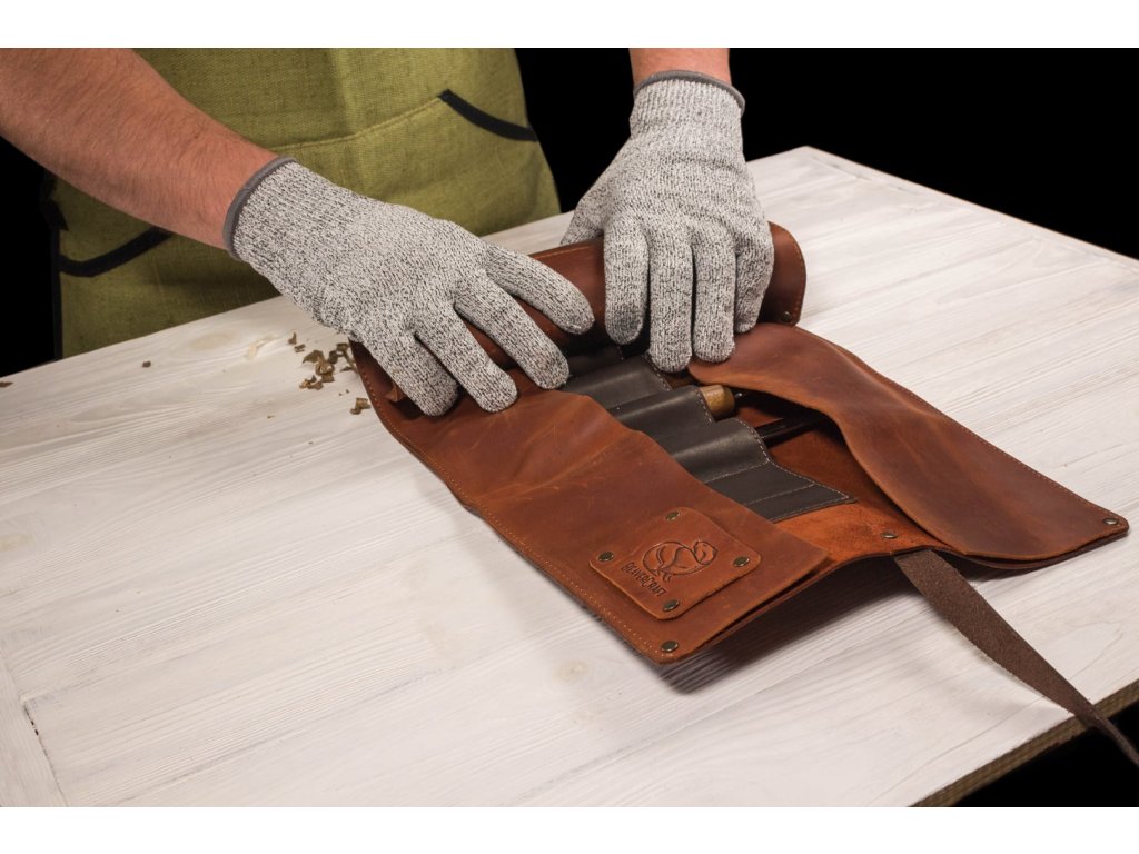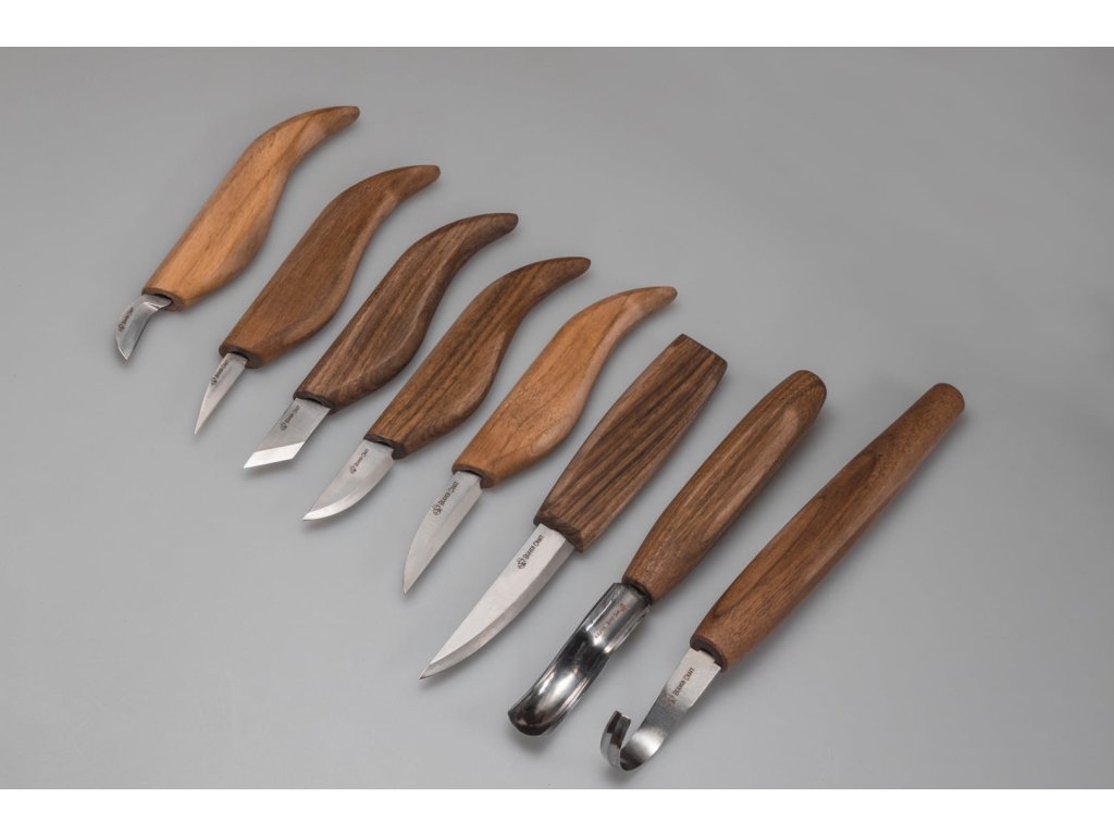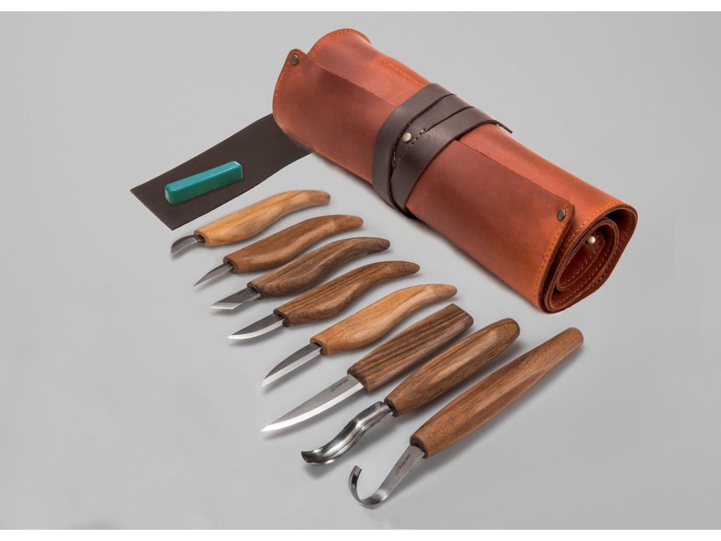 Setul conține 8 cuțite și dălți pentru sculptura în lemn, piele și pastă pentru ascuțit, care vă permit să transformați orice idee de sculptură în realitate. Cuțitele din acest set au un mâner ergonomic, realizat din lemn de nuc negru. Mânerele sunt tratate cu ulei de in pentru a fi protejate împotriva murdăriei, excesului de umiditate și a uscării materialului. Uneltele pentru sculptura în lemn sunt depozitate într-o husă din piele premium, care este inclusă în set.