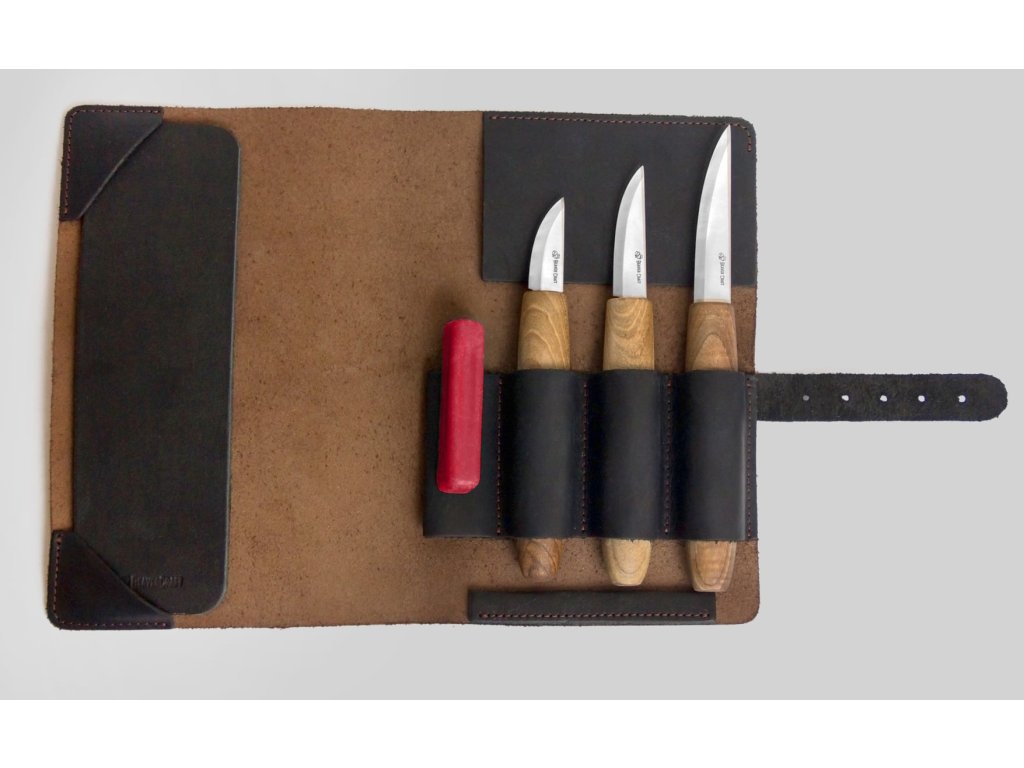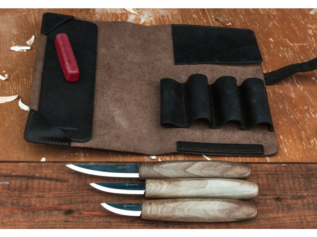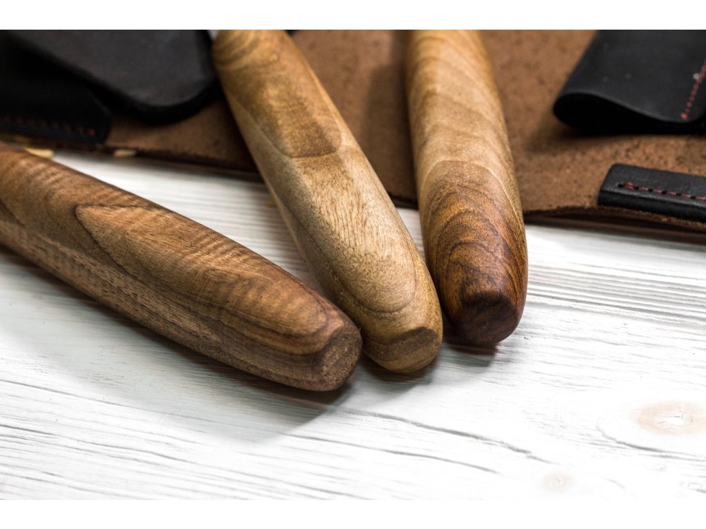 Setul conține 3 cuțite pentru sculptură în lemn. Uneltele vin în 3 dimensiuni diferite. Cuțitele din acest set au un mâner ergonomic, realizat din nuc negru. Mânerele sunt tratate cu ulei de in pentru a proteja împotriva murdăriei, excesului de umiditate și uscării materialului. Uneltele pentru sculptura în lemn sunt depozitate într-o husă din piele premium, care este inclusă în set.