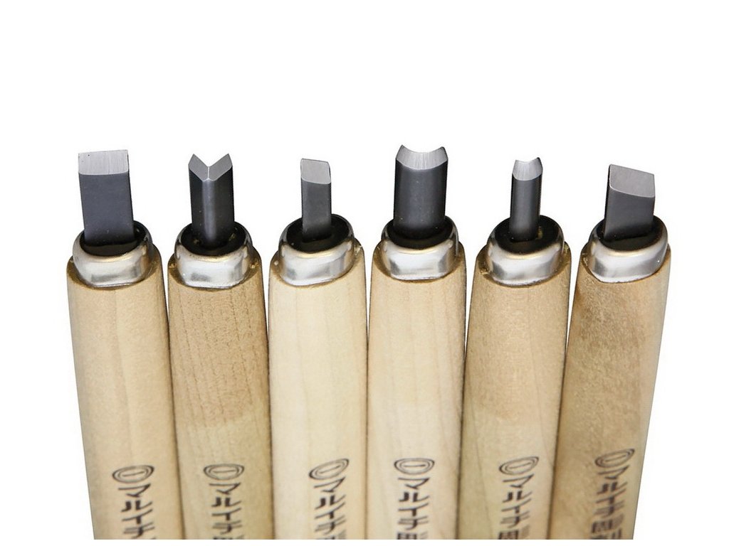 Kit de șapte cuțite japoneze, pentru scultura în lemn, Yoshiharu. Lamele sunt fabricate din oțel carbon. Lama din oțel carbon este predispusă la ruginire (cuțitul trebuie curățat, uscat și uns bine după utilizare). Mânere din lemn. Fabricat în Japonia.