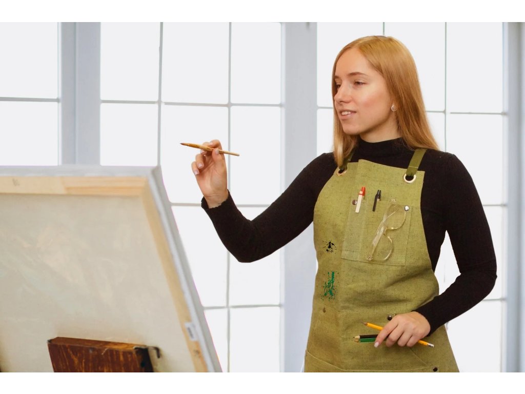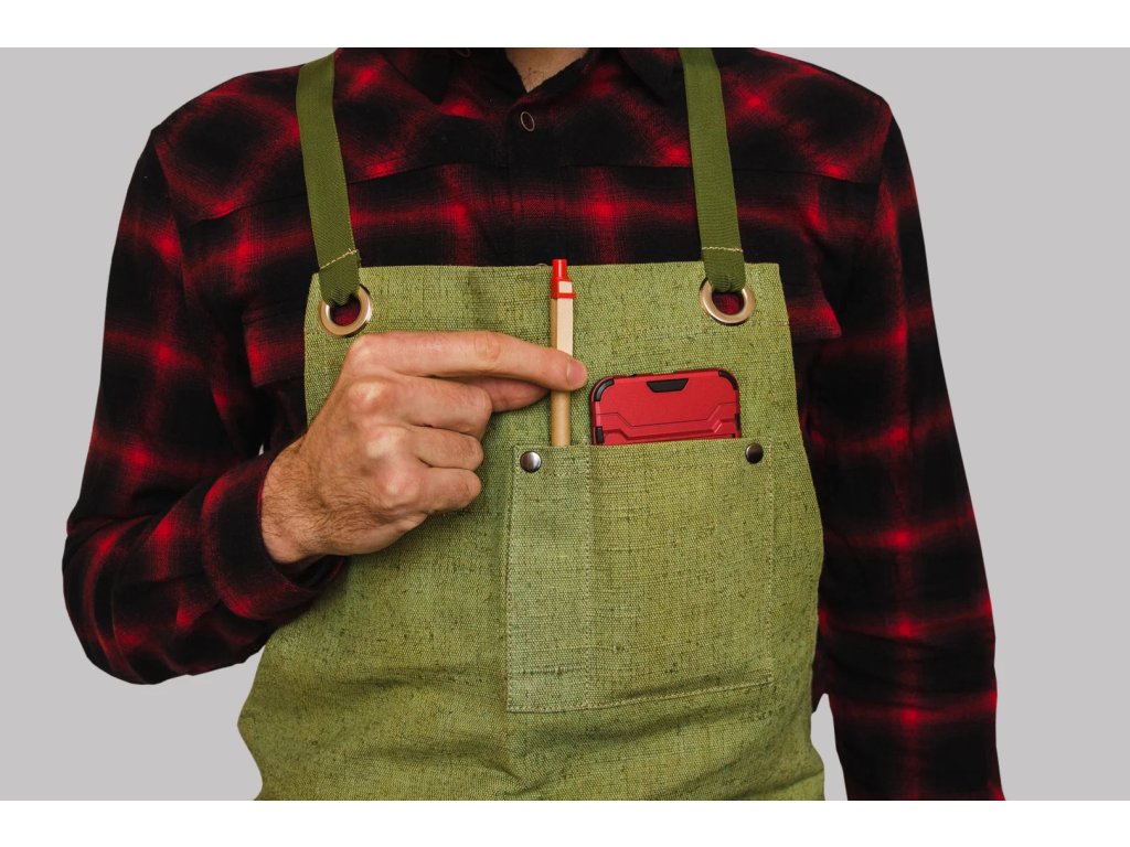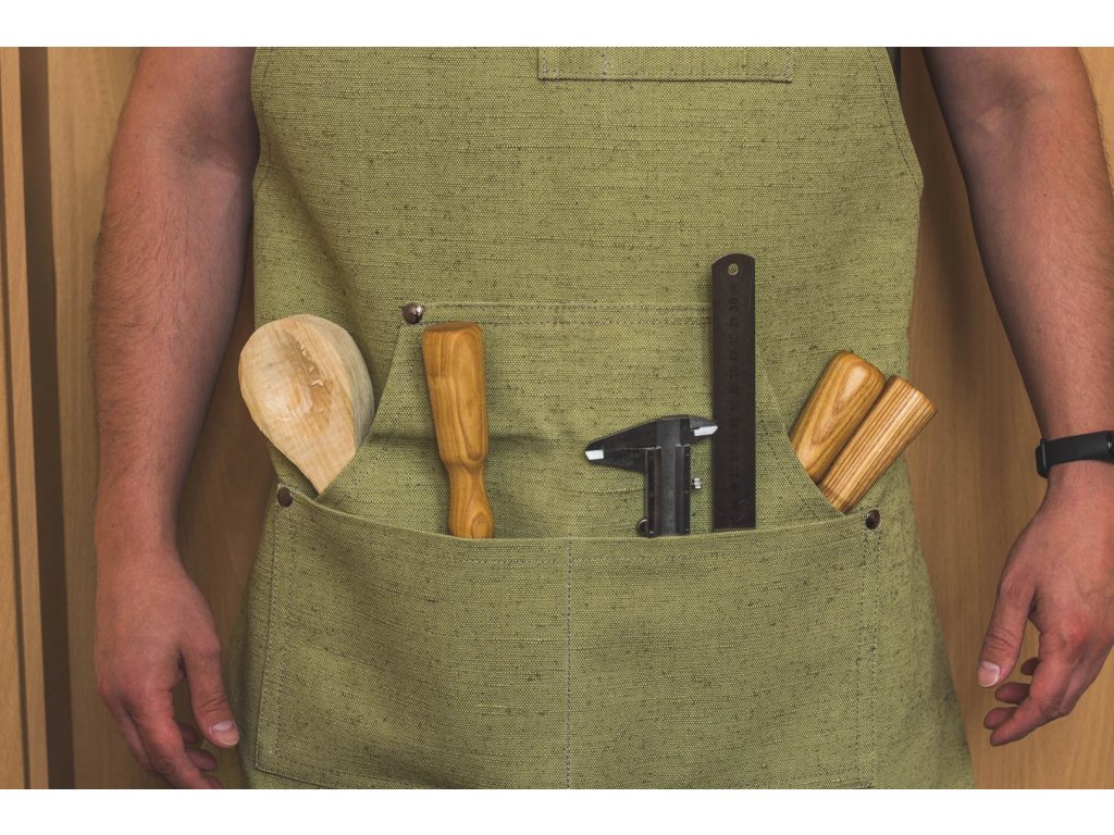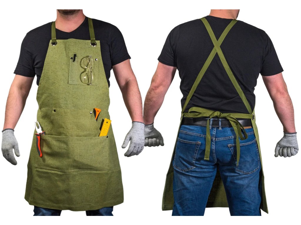 Șorț din pânză, verde, pentru sculptori, tâmplari, pictori și mulți alții. Are buzunare și bretele încrucișate în spate. Dimensiunile sunt 67,5 x 85 cm.