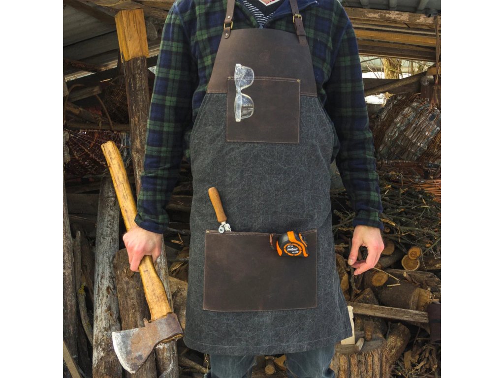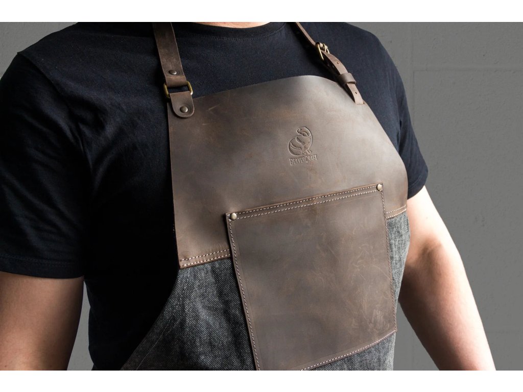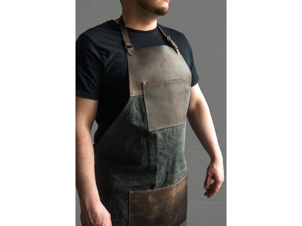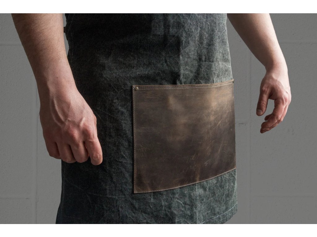 Șorț maro din piele și pânză pentru meșteșugari și pasionați de artizanat. Are buzunare practice din piele atașate cu nituri decorative.