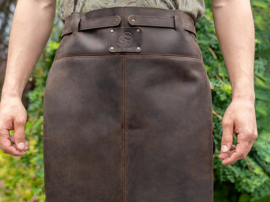 Șorț din piele, maro, potrivit pentru lucrări meșteșugărești și hobby-uri. Fabricat din piele „crazy horse”, grosime 2 mm.