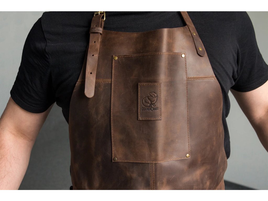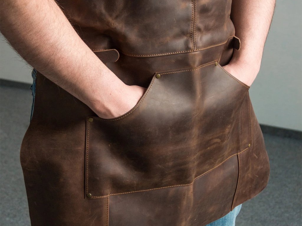 Șorț din piele, maro, potrivit pentru lucrări meșteșugărești și hobby-uri. Cu buzunare practice și o o structură netedă a pielii. Nu este greu pentru corp..