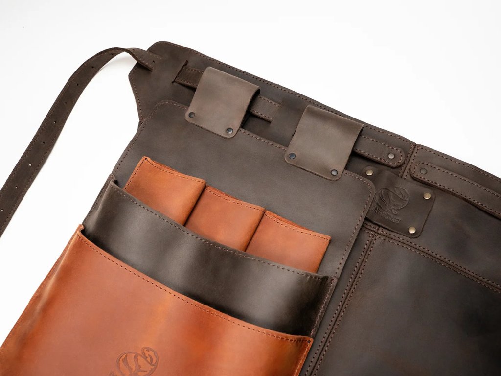 Șorț din piele, maro, cu suport pentru unelte, potrivit pentru lucrări meșteșugărești și hobby-uri. Fabricat din piele „crazy horse”, grosime 2 mm.