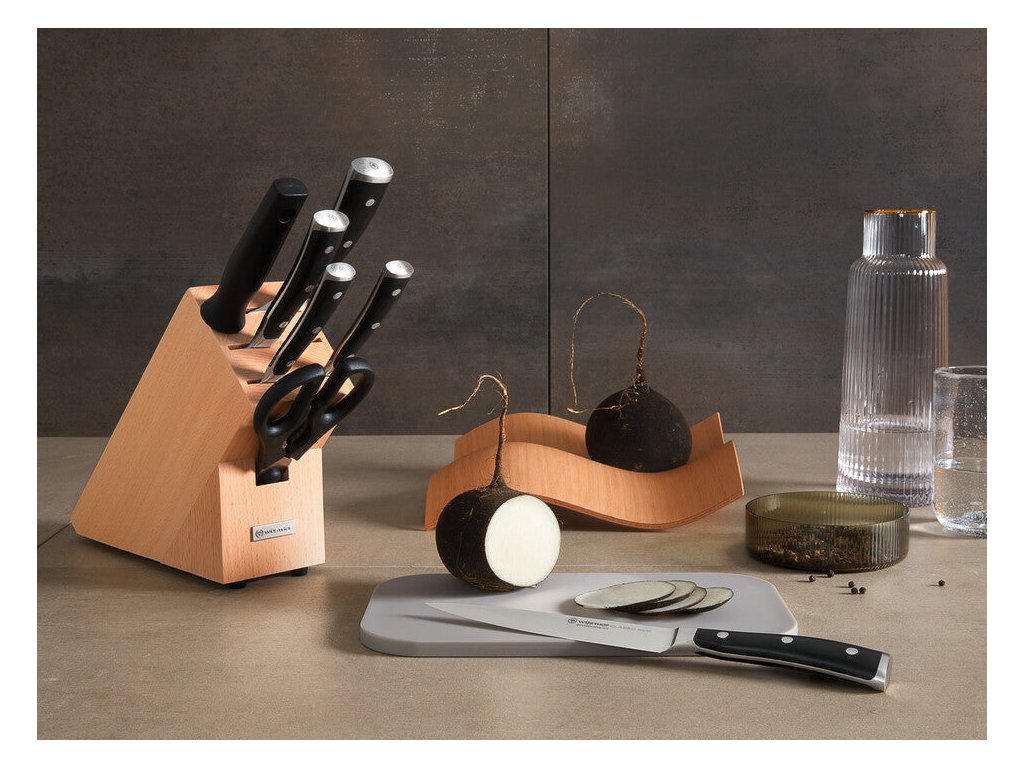Set de cuțite pentru bucătărie format din 8 componente (5 tipuri de cuțite de bucătărie, bloc pentru cuțite, masat și foarfecă) din ediția Wüsthof Classic Ikon.