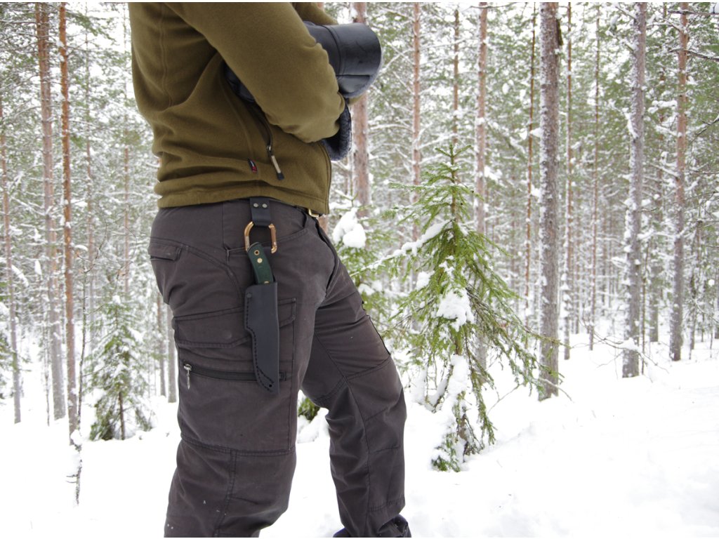 Agățătoare din piele pentru teacă de cuțit. cu carabină. Astfel puteți ajunge cu ușurință la cuțit, chiar dacă aveți o jachetă lungă sau un rucsac. De asemenea, datorită agățătoarei, cuțitul nu încurcă atunci când stați jos. Carabina este fabricată din aluminiu cu grosimea de 8 mm. Agățătoarea este fabricată din piele neagră, naturală, tăbăcită și este potrivită pentru curele cu o grosime de până la 5 cm. Agățătoarea este potrivit pentru teci cu o lățime de max. 3,4 cm.
