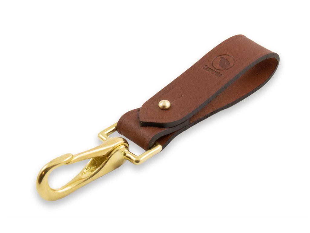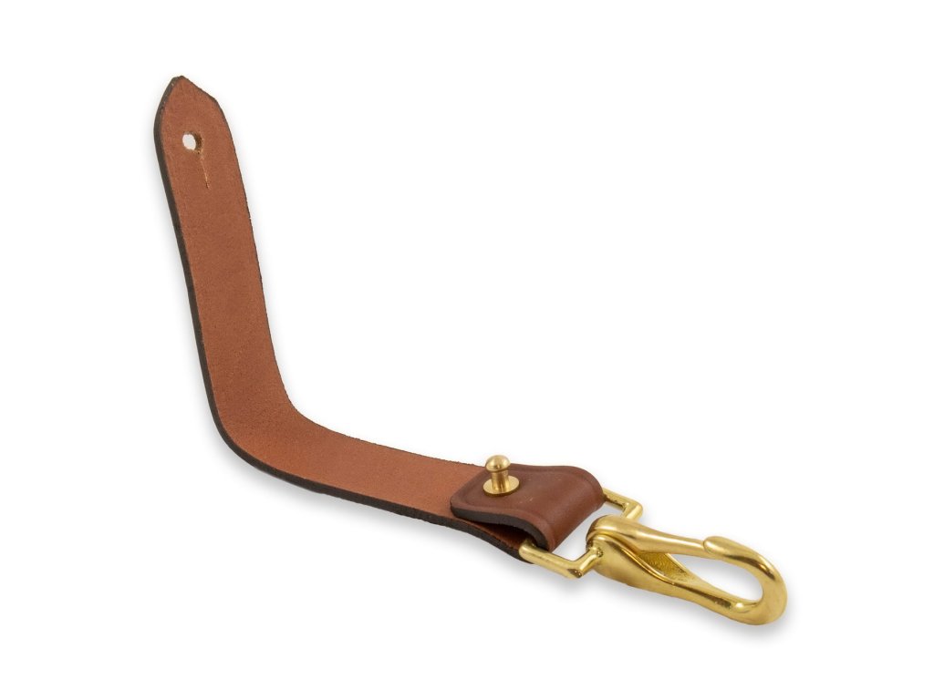 Agățătoare din piele cu carabină, de culoare maro. Se potrivește curelelor cu lățimea de până la 7 cm. Lungimea totală este de 15 cm, lățimea buclei este de 2,5 cm și greutatea este de 55 g.