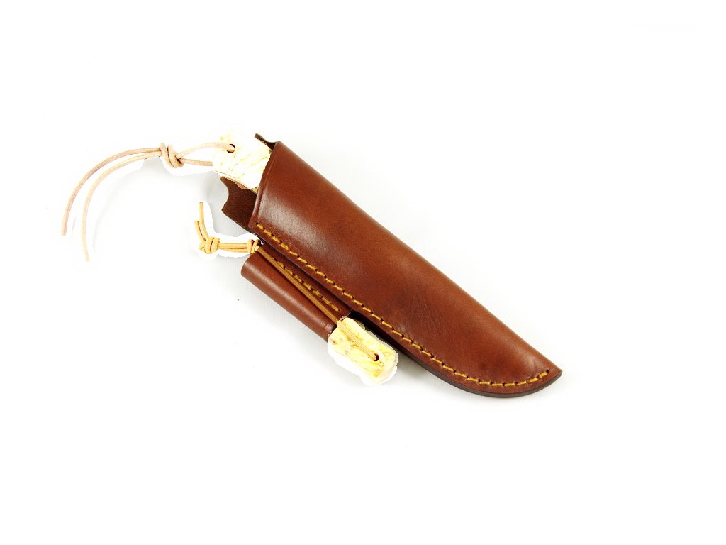 Teacă de schimb din piele pentru cuțitul Casstrom Woodsman cu suport pentru kit pentru aprinderea focului. Fabricată din piele maro, tăbăcită natural.