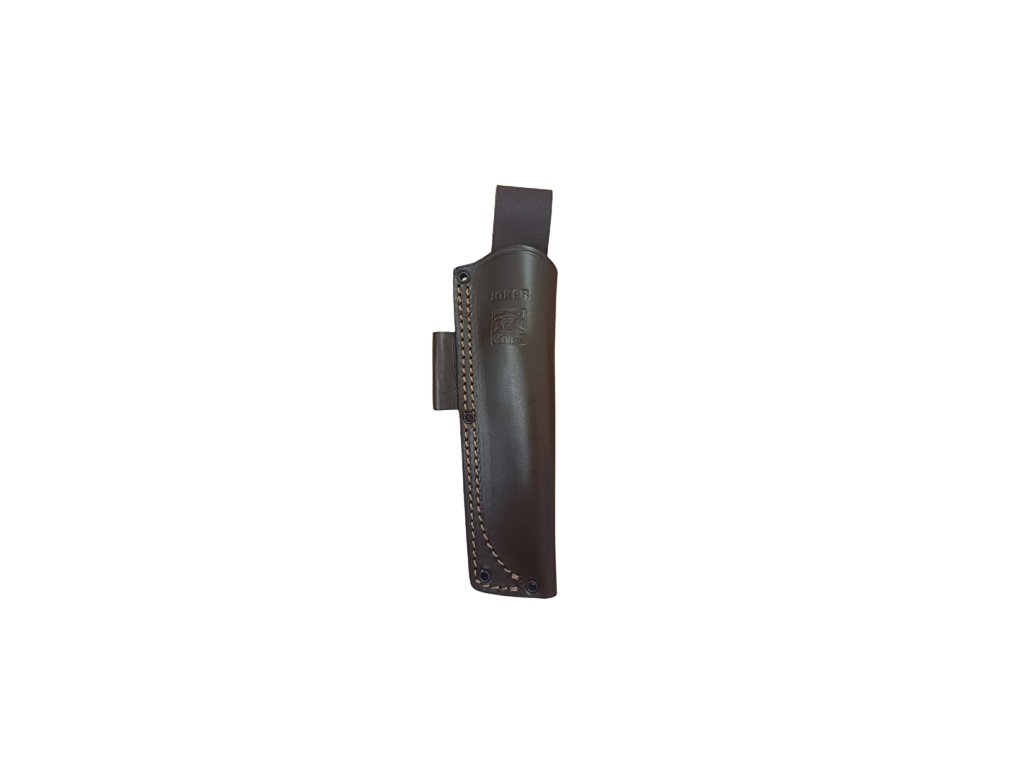Teacă din piele maro pentru cuțitul Joker Nomad cu suport pentru un kit pentru aprinderea focului. Teaca permite agățarea la curea. Cuțitul și kitul pentru aprindere focului nu sunt incluse.