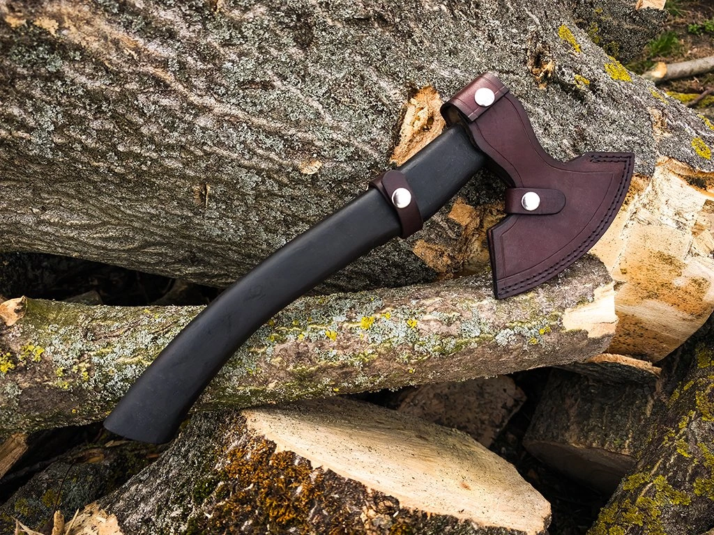 În pachet este inclusă o teacă din piele, care permite transportul comod al toporului în fiecare excursie în aer liber, în stil viking.