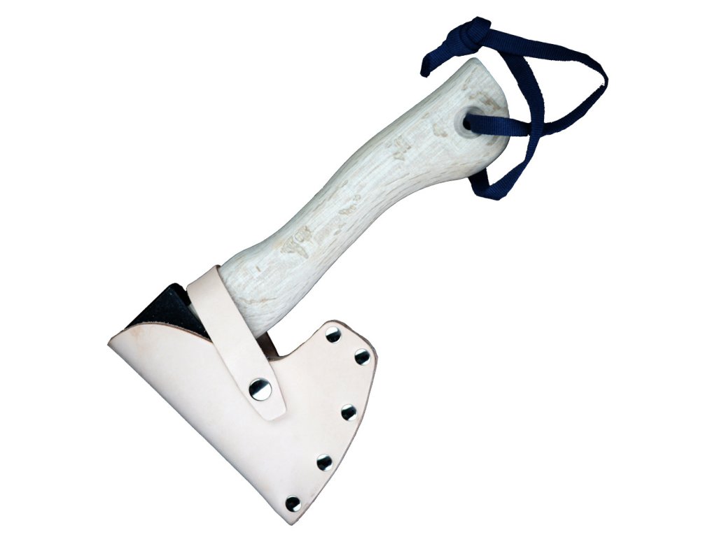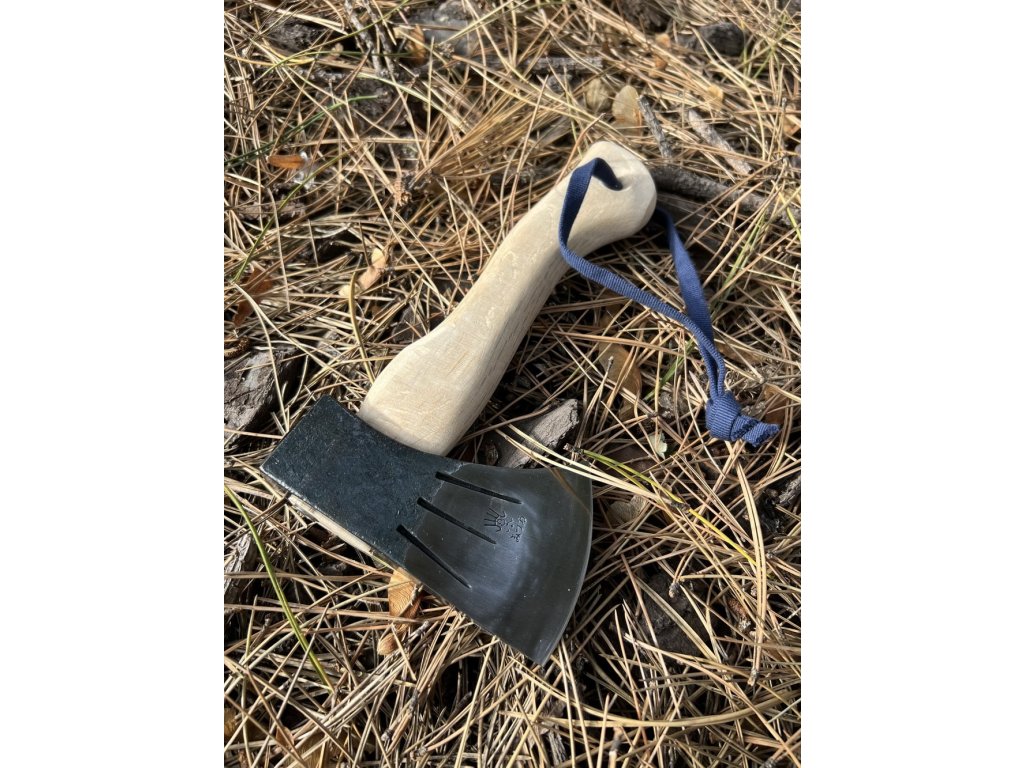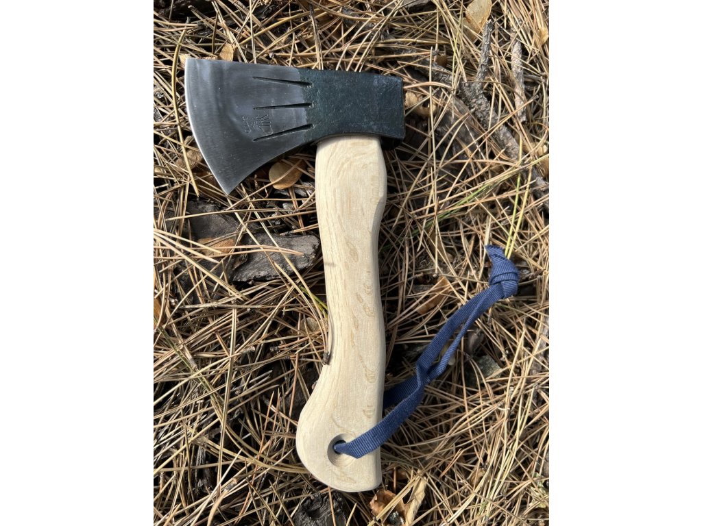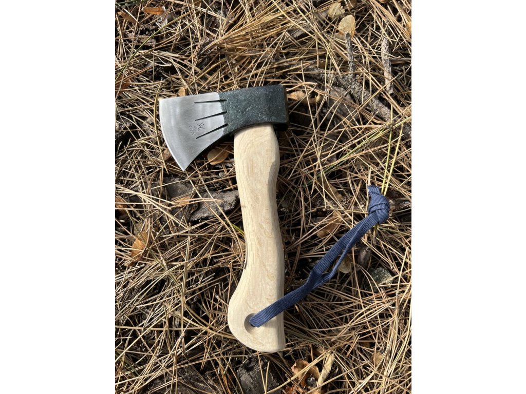 Topor japonez de pădure, de mici dimensiuni, din oțel carbon, mâner din stejar alb, lungimea mânerului de 24,5 cm și greutatea capului de topor de 420 g.