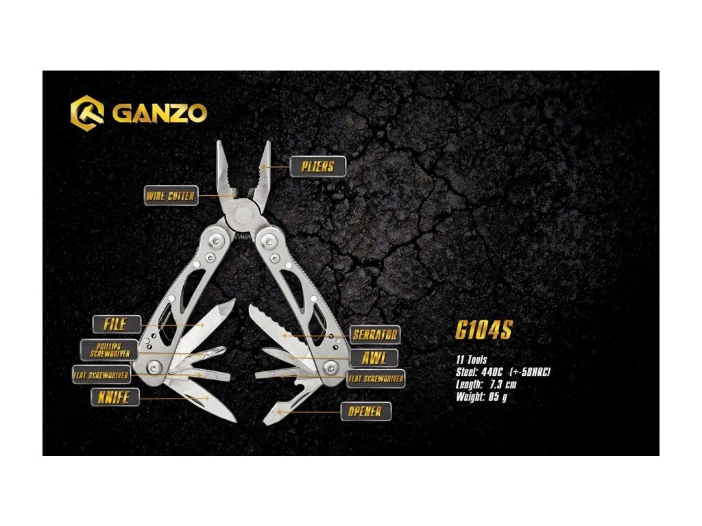 Multi-Tool G104S are 11 funcții și este un set de instrumente fiabil și compact atât pentru activități în aer liber, cât și pentru acasă. Este fabricat din oțel de bună calitate 440C, rezistent la coroziune. Include și o teacă practică. Greutate doar 126 g