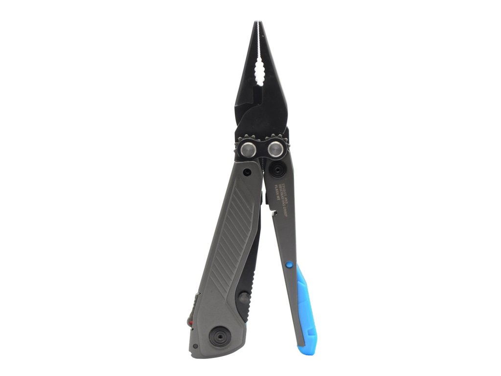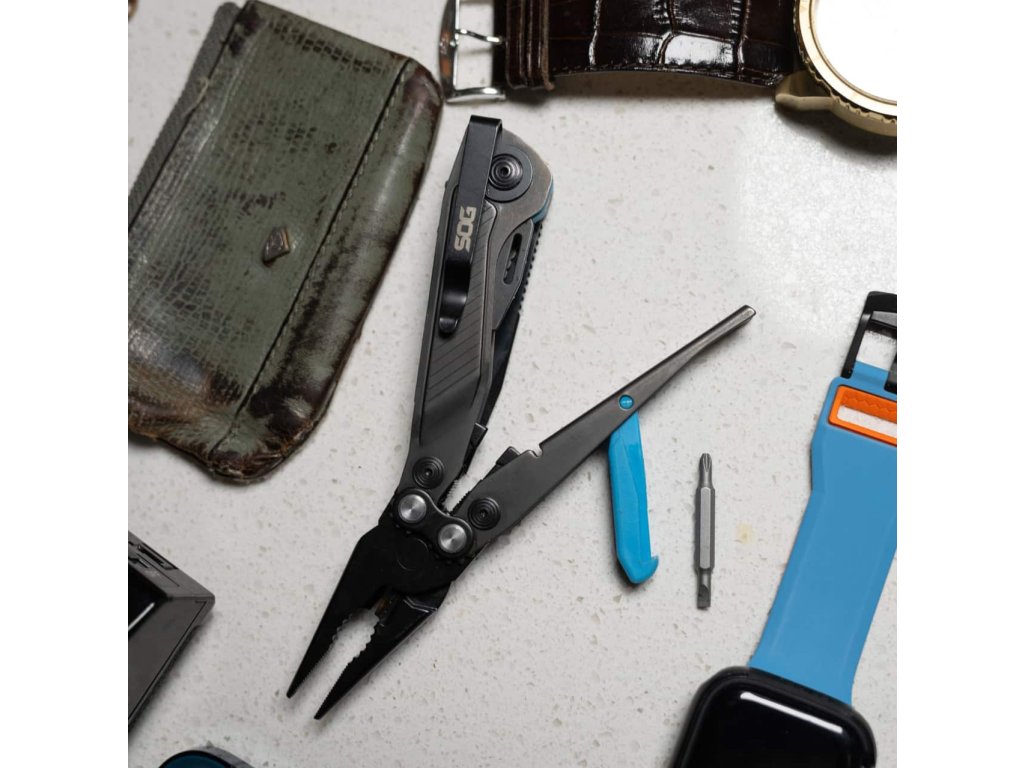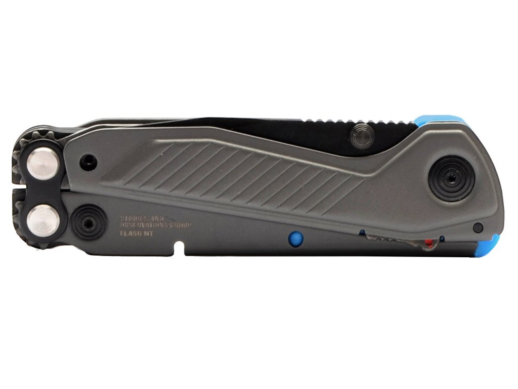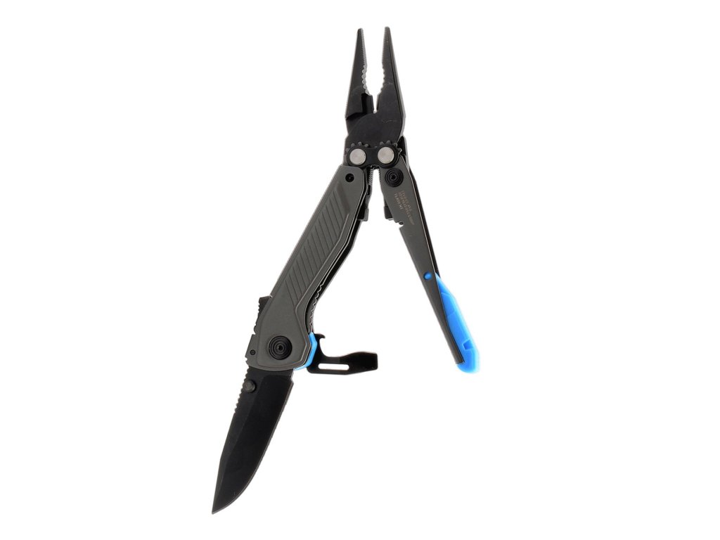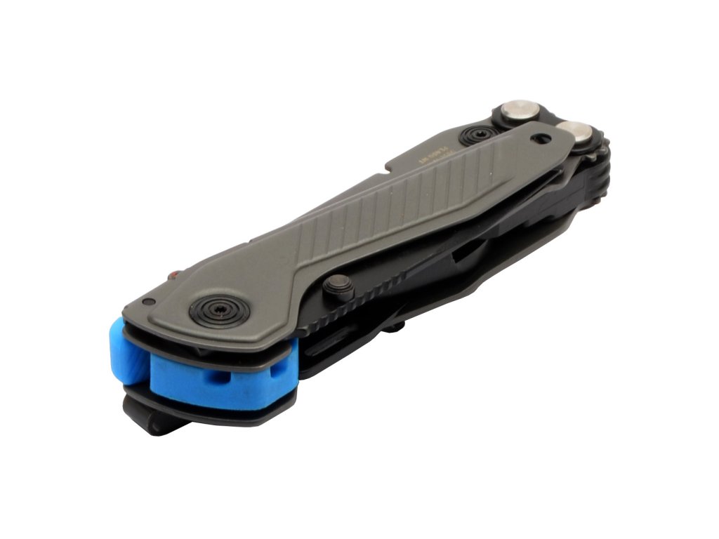 Unealtă multifuncțională cu o lungime de 14,2 cm. Mâner gri închis + albastru. 7 componente, inclusiv șurubelniță.