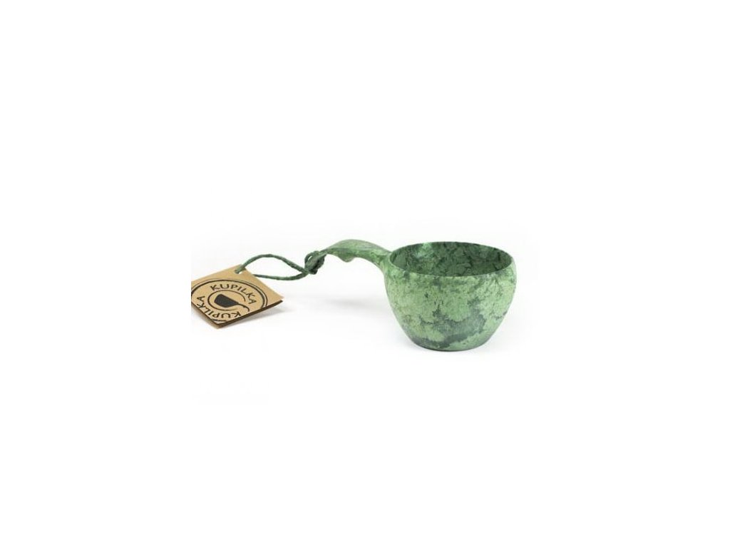 Cană în formă de kuksa tradițională realizată din material Kareline® de culoare verde. Acest material este unic prin combinarea fibrelor de lemn de pin și a termoplasticului într-un raport de 50:50. Acesta combină avantajele lemnului și ale plasticului. Este incasabil, tolerează temperaturi de la -30°C până la +110°C, este rezistent și ușor; nu absoarbe mirosurile alimentelor, este ușor de curățat și nu este sensibil la umezeală, precum vesela tradițională din lemn.