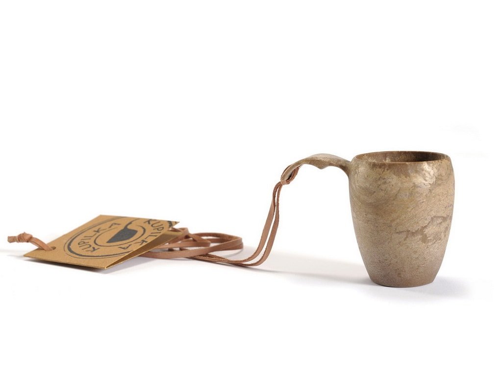 Ceașcă de 5 cl pentru ceai, cafea sau alte băuturi. Fabricată din material Kareline®. Acest material este unic prin combinarea fibrelor de lemn de pin și a termoplasticului într-un raport de 50:50. Acesta combină avantajele lemnului și ale plasticului. Este incasabil, tolerează temperaturi de la -30°C până la +110°C, este rezistent și ușor; nu absoarbe mirosurile alimentelor, este ușor de curățat și nu este sensibil la umezeală, precum vesela tradițională din lemn. Șnur din piele de ren pentru agățat la gât.