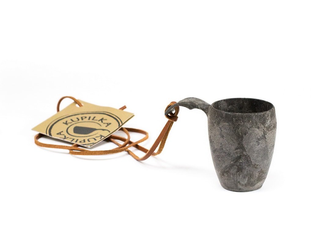 Ceașcă de 5 cl pentru ceai, cafea sau alte băuturi. Fabricată din material Kareline® de culoare neagră. Acest material este unic prin combinarea fibrelor de lemn de pin și a termoplasticului într-un raport de 50:50. Acesta combină avantajele lemnului și ale plasticului. Este incasabil, tolerează temperaturi de la -30°C până la +110°C, este rezistent și ușor; nu absoarbe mirosurile alimentelor, este ușor de curățat și nu este sensibil la umezeală, precum vesela tradițională din lemn. Șnur din piele de ren pentru agățat la gât.