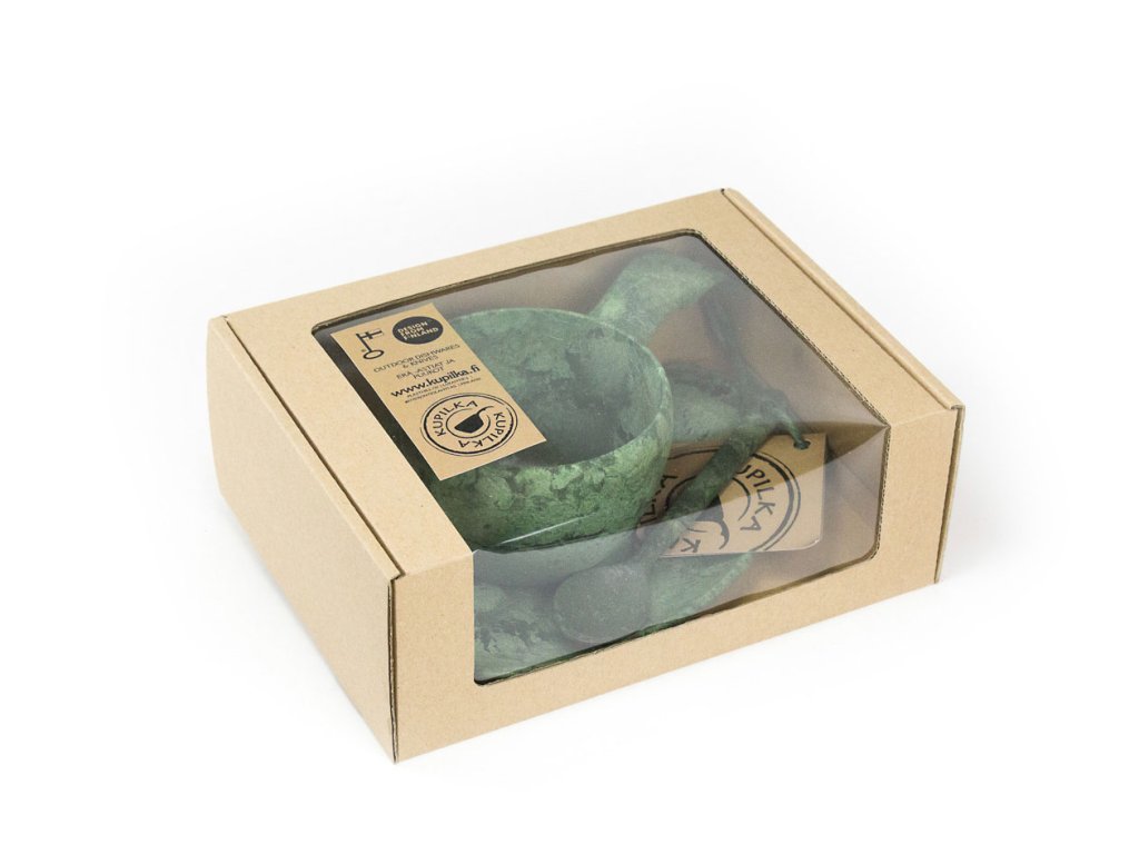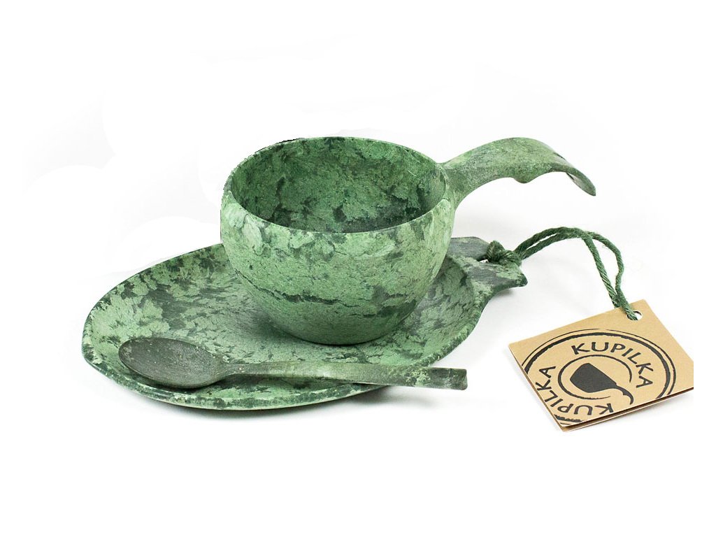 Pachet cadou ce conține o farfurie mai mică, o ceașcă în formă de kuksa tradițională și o lingură, fabricate din material Kareline® culoarea verde. Acest material este unic prin combinarea fibrelor de lemn de pin și a termoplasticului într-un raport de 50:50. Acesta combină avantajele lemnului și ale plasticului. Este incasabil, tolerează temperaturi de la -30°C până la +110°C, este rezistent și ușor; nu absoarbe mirosurile alimentelor, este ușor de curățat și nu este sensibil la umezeală, precum vesela tradițională din lemn.
