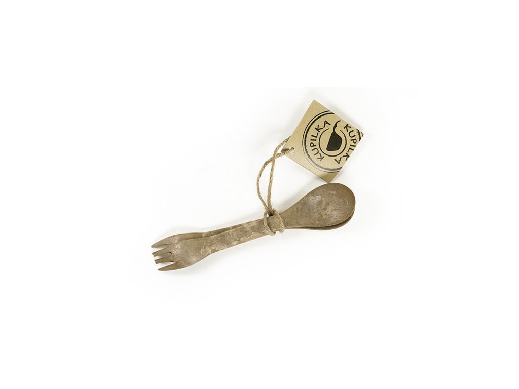 Spork (combinație de lingură și furculiță) de la producătorul finlandez Kupilka din material Kareline®. Acest material este unic prin combinarea fibrelor de lemn de pin și a termoplasticului într-un raport de 50:50. Acesta combină avantajele lemnului și ale plasticului. Este incasabil, tolerează temperaturi de la -30°C până la +110°C, este rezistent și ușor; nu absoarbe mirosurile alimentelor, este ușor de curățat și nu este sensibil la umezeală, precum vesela tradițională din lemn.