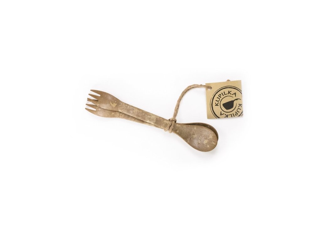 Spork (combinație de lingură și furculiță) de la producătorul finlandez Kupilka din material Kareline®. Acest material este unic prin combinarea fibrelor de lemn de pin și a termoplasticului într-un raport de 50:50. Acesta combină avantajele lemnului și ale plasticului. Este incasabil, tolerează temperaturi de la -30°C până la +110°C, este rezistent și ușor; nu absoarbe mirosurile alimentelor, este ușor de curățat și nu este sensibil la umezeală, precum vesela tradițională din lemn.
